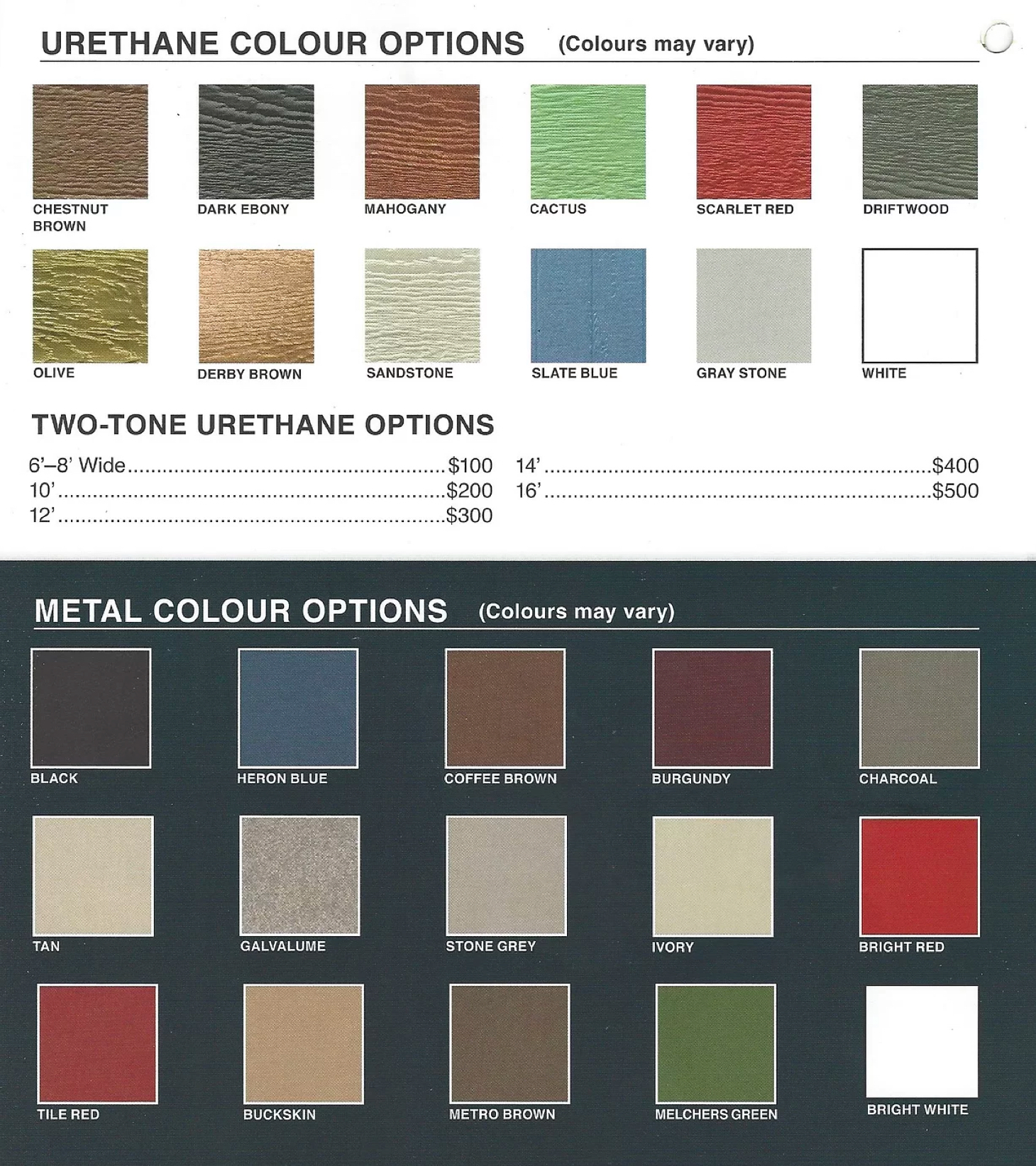 For siding colour choices see URETHANE COLOUR OPTIONS, for roof and trim colour choices see METAL COLOUR OPTIONS.